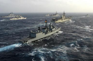 | Keywords: US Navy 040712-N-0119G-074 A formation of multi-nation ships steam through the Atlantic Ocean while participating in Majestic Eagle 2004.jpg en Atlantic Ocean July 12 2004 - The German frigate FGS Niedersachsen F 208 the Dutch frigate HNLMS Jacob Van Heemskerck F 812 the Italian aircraft carrier ITS Giuseppe Garibaldi C 551 the Moroccan frigate RMNS Lieutenant Colonel Errhamani F 501 USS La Salle AGF 3 and the Spanish aircraft carrier Principe De Asturias R 11 steam through the Atlantic Ocean while participating in Majestic Eagle 2004 Majestic Eagle is a multinational exercise being conducted off the coast of Morocco The exercise demonstrates the combined force capabilities and quick response times of the participating naval air undersea and surface warfare groups Countries involved in the NATO led exercise include the United Kingdom Morocco France Italy Portugal Spain and Turkey Truman's participation in Majestic Eagle is part of her scheduled deployment supporting the Navy's new fleet response plan FRP Summer Pulse 2004 the simultaneous deployment of seven carrier strike groups CSGs demonstrating the ability of the Navy to provide credible combat across the globe in five theaters with other U S allied and coalition military forces U S Navy photo by Photographer's Mate Airman Rob Gaston RELEASED For more information go to <a href http //www cffc navy mil/summerpulse04 htm Target _BLANK >http //www cffc navy mil/summerpulse04 htm</a> 2004-07-12 040712-N-0119G-074 Navy http //www navy mil/view_image asp id 16091 U S Navy photo by Photographer's Mate Airman Rob Gaston PD-USGov-Military-Navy MEDSHARK-Majestic Eagle 2004 Summer Pulse 2004 General views of USS La Salle AGF-3 F812 Jacob van Heemskerck ship 1986 Giuseppe Garibaldi C 551 F208 Niedersachsen ship 1982 501 Lieutenant Colonel Errhamani ship 1983 R11 Principe de Asturias ship 1988 Bundeswehr in 2004 Ship formations |