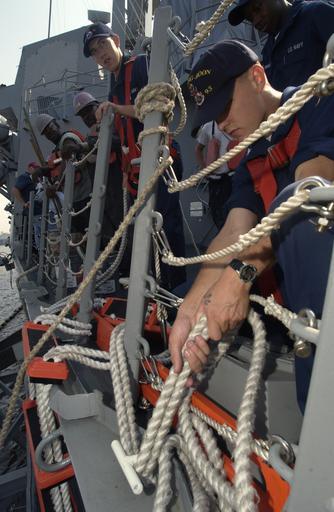 Keywords: US Navy 040715-N-5862D-244 Boatswain's Mate 3rd Class Ben Gozales from Salt Lake City, Utah, secures the pilots ladder on the port side of the ship while inport at Naval Station Pascagoula, Miss.jpg en Pascagoula Miss July 15 2004 - Boatswain's Mate 3rd Class Ben Gozales from Salt Lake City Utah secures the pilots ladder on the port side of the ship while inport at Naval Station Pascagoula Miss Gonzales is assigned to the deck department aboard the Navy's newest Arleigh Burke-class guided missile destroyer USS Chung-Hoon DDG 93 Chung-Hoon is making preparations to depart the Pascagoula shipyard and steam towards her new homeport in Pearl Harbor Hawaii where she will be officially commissioned later this year U S Navy photo by Chief Photographer's Mate Chris Desmond RELEASED 2004-07-15 040715-N-5862D-244 Navy http //www navy mil/view_image asp id 16534 U S Navy photo by Chief Photographer's Mate Chris Desmond PD-USGov-Military-Navy Aboard Chung-Hoon DDG-93 Naval Station Pascagoula |