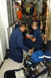 Keywords: US Navy 040715-N-7232R-042 A medical emergency team attends to a simulated heart attack victim during a medical response drill aboard USS John C Stennis (CVN 74).jpg en Pacific Ocean July 15 2004 - A medical emergency team attends to a simulated heart attack victim during a medical response drill aboard USS John C Stennis CVN 74 Stennis and her air wing Carrier Air Wing Fourteen CVW-14 are taking part in Rim of the Pacific RIMPAC 2004 during her scheduled deployment supporting the Navy's new Fleet Response Plan FRP Summer Pulse 2004 RIMPAC is the largest international maritime exercise in the waters around the Hawaiian Islands This year's exercise includes seven participating nations; Australia Canada Chile Japan South Korea United Kingdom and United States RIMPAC is intended to enhance the tactical proficiency of participating units in a wide array of combined operations at sea while enhancing stability in the Pacific Rim region U S Navy photo by Photographer's Mate Airman Ryan J Restvedt RELEASED For more information go to <a href http //www cpf navy mil/RIMPAC2004 Target _BLANK >http //www cpf navy mil/RIMPAC2004</a>/ 2004-07-15 040715-N-7232R-042 Navy http //www navy mil/view_image asp id 16198 U S Navy photo by Photographer's Mate Airman Ryan J Restvedt PD-USGov-Military-Navy Aboard USS John C Stennis CVN-74