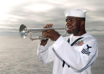 | Keywords: US Navy 040718-N-7781D-038 A bugler plays TAPS during a wreath laying ceremony held on the flight deck in memorial of Captain Franklin Hooks II.jpg en Atlantic Ocean July 18 2004 - A bugler plays TAPS during a wreath laying ceremony held on the flight deck in memorial of Captain Franklin Hooks II assigned to Marine Fighter-Attack Squadron One One Five VMFA-115 Hooks died when his F/A-18 Hornet jet crashed while conducting exercises off the aircraft carrier USS Harry S Truman near the Azores Islands on June 26 Hooks began his military career as an Electronics Technician when he joined the Navy in 1990 In 1993 he was appointed to the U S Naval Academy from which he graduated in 1997 Truman CVN 75 is participating in Majestic Eagle a multinational exercise being conducted off the coast of Morocco The exercise demonstrates the combined force capabilities and quick response times of the participating naval air undersea and surface warfare groups Countries involved in the U S -led exercise include the United Kingdom Morocco France Italy Portugal Spain and Turkey Truman's participation in Majestic Eagle is part of her scheduled deployment supporting the Navy's new fleet response plan FRP Summer Pulse 2004 the simultaneous deployment of seven carrier strike groups CSGs demonstrating the ability of the Navy to provide credible combat across the globe in five theaters with other U S allied and coalition military forces U S Navy photo by Photographer's Mate 2nd Class Andrea Decanini RELEASED For more information go to <a href http //www cffc navy mil/summerpulse04 htm Target _BLANK >www cffc navy mil/summerpulse04 htm</a> 2004-07-18 040718-N-7781D-038 Navy http //www navy mil/view_image asp id 16291 U S Navy photo by Photographer's Mate 2nd Class Andrea Decanini PD-USGov-Military-Navy Aboard USS Harry S Truman CVN-75 MEDSHARK-Majestic Eagle 2004 Summer Pulse 2004 Taps bugle call |