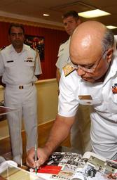 | Keywords: US Navy 040727-N-8148A-006 Chief of Naval Staff, Pakistan Navy, Adm. Shahid Karimullah, signs his name on the guest book of Capt. James Symonds.jpg en Naval Station North Island Calif July 27 2004 - Chief of Naval Staff Pakistan Navy Adm Shahid Karimullah signs his name on the guest book of Capt James Symonds Commanding Officer USS Ronald Reagan CVN 76 during an official visit U S Navy photo by Photographer s Mate 3rd Class Kitt Amaritnant RELEASED 2004-07-27 040727-N-8148A-006 Navy http //www navy mil/view_image asp id 16761 U S Navy photo by Photographer s Mate 3rd Class Kitt Amaritnant PD-USGov-Military-Navy Captain's cabin of USS Ronald Reagan CVN-76 Guestbook signing Guests aboard USS Ronald Reagan CVN-76 Shahid Karimullah |