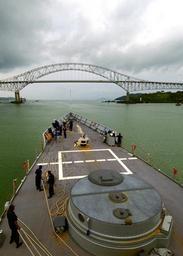 | Keywords: US Navy 040810-N-7631T-004 The guided missile frigate USS John L. Hall (FFG 32) departs for sea in preparation for PANAMAX 2004.jpg en Gulf of Panama Aug 10 2004 The guided missile frigate USS John L Hall FFG 32 departs for sea in preparation for PANAMAX 2004 Naval forces from eight countries are participating in PANAMAX 2004 a naval exercise designed to build up a coalition response to security threats against the Panama Canal PANAMAX is conducted under the direction of Commander Naval Forces Southern Command and involves the identification monitoring and interdiction of vessels posing a simulated terrorist threat to the Canal The multinational force includes surface and air assets from Argentina Colombia Chile Dominican Republic Honduras Panama Peru and the United States operating in the north and south approaches to the Canal PANAMAX s realistic scenario develops not only interoperability among naval forces but also joint and inter-agency interoperability as the naval forces work together with other services and agencies of Panama to ensure the safety of the Canal and to protect freedom of navigation U S Navy photo by Photographer's Mate 2nd Class Kevin R Tidwell RELEASED 2004-08-10 040810-N-7631T-004 Navy http //www navy mil/view_image asp id 17063 U S Navy photo by Photographer's Mate 2nd Class Kevin R Tidwell PD-USGov-Military-Navy Bridge of the Americas Panama PANAMAX 2004 USS John L Hall FFG-32 |