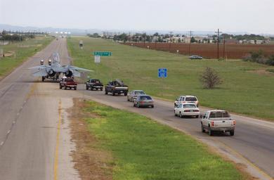 | Keywords: US Navy 040813-F-0017M-004 A line of cars follow the decommissioned F-14A Tomcat while it is towed from San Angelo Regional Airport to Goodfellow Air Force Base, Texas.jpg en San Angelo Texas Aug 13 2004 - A line of cars follow the decommissioned F-14A Tomcat last assigned to the Checkmates of Fighter Squadron Two One One VF-211 while it is towed from San Angelo Regional Airport to Goodfellow Air Force Base Texas The aircraft was escorted by San Angelo Police Department Goodfellow AFB bought the F-14A Tomcat for 20 000 to be used for training by the 312th Training Squadron's Fire Training Academy The aircraft's engines weapons systems and avionics had to be removed before transport to Goodfellow AFB and a few safety alterations will have to be made for the plane to be used for training U S Air Force photo by Airman 1st Class Michele G Misiano RELEASED 2004-08-13 040813-F-0017M-004 Navy http //www navy mil/view_image asp id 17258 U S Navy photo PD-USGov-Military-Navy Images from US Navy location San Angelo Texas F-14A Tomcat museum aircraft Transport of aircraft |