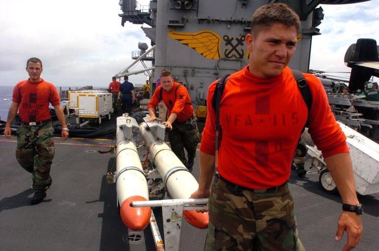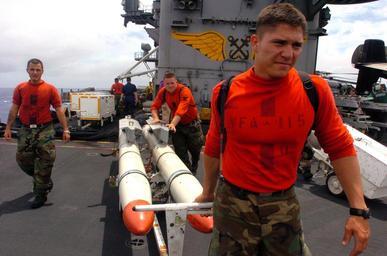| Keywords: US Navy 040816-N-7732W-063 Aviation Ordnanceman 3rd Class Paul Casteneda and Aviation Ordnanceman Airman Ty Palmer move two AGM-88 High-Speed Anti-radiation Missiles.jpg en Western Pacific Ocean Aug 16 2004 - Aviation Ordnanceman 3rd Class Paul Casteneda right of Lemoore Calif and Aviation Ordnanceman Airman Ty Palmer center of Dayton Ohio move two AGM-88 High-Speed Anti-radiation Missiles HARM on the flight deck aboard USS John C Stennis CVN 74 The missiles are designated for a waiting F/A-18E Super Hornet assigned to the Eagles of Strike Fighter Squadron One One Five VFA-115 assigned to Carrier Air Wing Fourteen CVW-14 Stennis and CVW-14 are at sea on a scheduled deployment conducting exercises in the Western Pacific U S Navy photo by Photographer's Mate Airman Charles D Whetstine RELEASED 2004-08-16 040816-N-7732W-063 Navy http //www navy mil/view_image asp id 17100 U S Navy photo by Photographer's Mate Airman Charles D Whetstine PD-USGov-Military-Navy Aviation Ordnanceman USS John C Stennis CVN-74 flight deck AGM-88 HARM Strike Fighter Squadron 115 United States Navy |