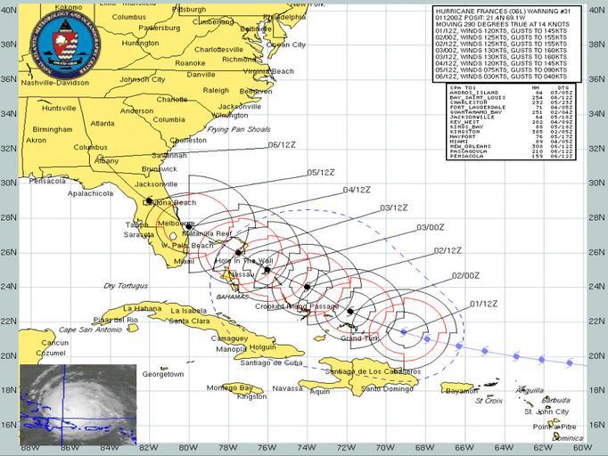 Keywords: US Navy 040901-N-0000X-003 Current forecast projected path and wind speeds of Hurricane Frances from Sept 1 to Sept 6.jpg en Mid-Atlantic Ocean Sept 1 2004 Current forecast projected path and wind speeds of Hurricane Frances from Sept 1 to Sept 6 Frances a category four hurricane on the Saffir-Simpson hurricane scale is approximately 700 miles east-southeast of the Florida East Coast moving at near 14 knots Maximum sustained winds remain near 140 MPH with winds extending outwards up to 80 miles The core of the storm is expected to be near Florida within two days only three weeks after Hurricane Charley left billions of dollars in damage as it swept across the peninsula Photo provided by Naval Atlantic Meteorology and Oceanography Center RELEASED For more information visit <a href http //weather navy mil Target _BLANK >http //weather navy mil</a> 2004-09-01 040901-N-0000X-003 Navy http //www navy mil/view_image asp id 17328 U S Navy photo PD-USGov-Military-Navy Hurricane Frances |
