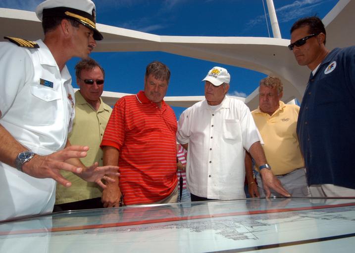| Keywords: US Navy 040902-N-3019M-004 Capt. Michael C. Vitale, commander, Navy Region Hawaii and commander, Naval Surface Group Middle Pacific, explains the events surrounding the attack on Pearl Harbor to National Football League (NFL) H.jpg en Pearl Harbor Hawaii Sept 2 2004 - Capt Michael C Vitale commander Navy Region Hawaii and commander Naval Surface Group Middle Pacific explains the events surrounding the attack on Pearl Harbor to National Football League NFL Hall of Fame quarterback Terry Bradshaw at the USS Arizona Memorial Bradshaw along with Armando Fitz from the Navy NASCAR team received a barge tour of Pearl Harbor and USS Arizona Memorial conducted by Capt Michael C Vitale Bradshaw and Fitz were at Pearl Harbor to attend the 59th anniversary of the end of World War II held on the decommissioned battleship USS Missouri U S Navy photo by Journalist Seaman Ryan C McGinley RELEASED 2004-09-02 040902-N-3019M-004 Navy http //www navy mil/view_image asp id 17405 U S Navy photo by Journalist Seaman Ryan C McGinley PD-USGov-Military-Navy USS Arizona Memorial interior Michael C Vitale Terry Bradshaw Armando Fitz |