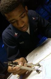 | Keywords: US Navy 040902-N-1485H-011 Operations Specialist 2nd Class Larry White of Houston, Texas, plots a safe passage for the aircraft carrier USS Kitty Hawk (CV 63) using an inbound harbor chart.jpg en Pacific Ocean Sept 2 2004 - Operations Specialist 2nd Class Larry White of Houston Texas plots a safe passage for the aircraft carrier USS Kitty Hawk CV 63 using an inbound harbor chart Operations specialists work closely with quartermasters in the daily plotting updating and maintaining of navigational charts Kitty Hawk is currently under way in the 7th Fleet area of responsibility AOR demonstrating power projection and sea control as the world's only permanently forward-deployed aircraft carrier operating from Yokosuka Japan U S Navy photo by Photographer's Mate 3rd Class Lamel J Hinton RELEASED 2004-09-02 040902-N-1485H-011 Navy http //www navy mil/view_image asp id 17490 U S Navy photo by Photographer's Mate 3rd Class Lamel J Hinton PD-USGov-Military-Navy Aboard USS Kitty Hawk CV-63 Operations Specialist United States Navy |