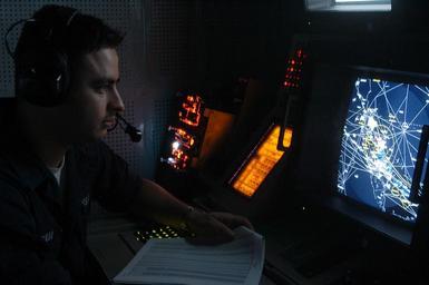 | Keywords: US Navy 040929-N-1205W-002 Operations Specialist Seaman Jerry Portillo monitors the Auto Tracking Management console, which detects and track surface contacts in the Combat Direction Center (CDC) aboard the conventionally power.jpg en Arabian Gulf Sept 29 2004 - Operations Specialist Seaman Jerry Portillo monitors the Auto Tracking Management console which detects and track surface contacts in the Combat Direction Center CDC aboard the conventionally powered aircraft carrier USS John F Kennedy CV 67 CDC personnel gather information on the tactical situation and present it to the Tactical Action Officer TAO for evaluation Kennedy and embarked Carrier Air Wing Seventeen CVW-17 are currently on deployment in the 5th Fleet area of responsibility AOR in support of Operation Iraqi Freedom OIF U S Navy photo by Photographer s Mate 2nd Class Regina Wiss RELEASED 2004-09-29 040929-N-1205W-002 Navy http //www navy mil/view_image asp id 17977 U S Navy photo by Photographer s Mate 2nd Class Regina Wiss PD-USGov-Military-Navy Aboard USS John F Kennedy CV-67 Operations Specialist United States Navy |