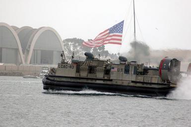 | Keywords: US Navy 041002-N-1722M-005 A Landing Craft Air Cushion (LCAC), assigned to the amphibious assault ship USS Tarawa (LHA 1), passes in front of Naval Base Coronado-Naval Air Station North Island with the American Flag in the back.jpg en San Diego Calif Oct 2 2004 - A Landing Craft Air Cushion LCAC assigned to the amphibious assault ship USS Tarawa LHA 1 passes in front of Naval Base Coronado/Naval Air Station North Island with the American Flag in the back ground during the Sea and Air Parade The parade of Navy and Coast Guard ships was part of the Fleet Week 2004 celebration held in San Diego bay Fleet Week San Diego is a three-week tribute to military members and their families who make San Diego and Southern Calif the largest concentration of Navy and Marine forces in the world U S Navy Photo by Photographer's Mate 1st Class Michael Moriatis RELEASED 2004-10-02 041002-N-1722M-005 Navy http //www navy mil/view_image asp id 18085 U S Navy Photo by Photographer's Mate 1st Class Michael Moriatis PD-USGov-Military-Navy LCAC-43 ship 1992 Naval Air Station North Island in the 2000s Fleet Week San Diego Watercraft in motion |