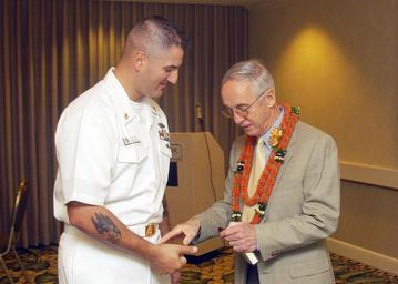 | Keywords: US Navy 041013-N-6775N-014 Chief Sonar Technician Mark Williams presents a command challenge coin to Secretary of the Navy, the Honorable Gordon R. England.jpg en Waikiki Hawaii Oct 13 2004 - Chief Sonar Technician Mark Williams presents a command challenge coin to Secretary of the Navy the Honorable Gordon R England at the 2004 Navy Birthday Breakfast sponsored by the Honolulu Council Navy League Chief Williams of Sydney Maine is currently assigned to the Los-Angeles-class attack submarine USS Columbia SSN 771 U S Navy photo by Photographer's Mate 2nd Class Justin P Nesbitt RELEASED 2004-10-13 041013-N-6775N-014 Navy http //www navy mil/view_image asp id 18191 U S Navy photo by Photographer's Mate 2nd Class Justin P Nesbitt PD-USGov-Military-Navy Images from US Navy location Waikiki Hawaii USS Columbia SSN-771 Challenge coins Gordon R England Men with arm tattoos |