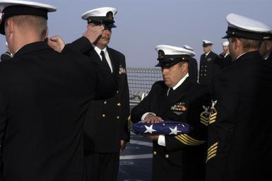 | Keywords: US Navy 041014-N-6477M-228 Chief Hospital Corpsman James Hopper and fellow chiefs assigned to USS Momsen (DDG 92), pay their final respects to four shipmates during a burial at sea.jpg en Pacific Ocean Oct 14 2004 Chief Hospital Corpsman James Hopper and fellow chiefs assigned to USS Momsen DDG 92 pay their final respects to four shipmates during a burial at sea aboard the guided missile destroyer in the Strait of Juan de Fuca The families of the deceased all received a folded American flag three casing from bullets used during the 21-gun salute a video of the ceremony and a chart locating exactly where their family member s were laid to rest U S Navy photo by Photographer s Mate 2nd Class Eli J Medellin RELEASED 2004-10-14 041014-N-6477M-228 Navy http //www navy mil/view_image asp id 18331 U S Navy photo by Photographer s Mate 2nd Class Eli J Medellin PD-USGov-Military-Navy Sea burials USS Momsen DDG-92 Strait of Juan de Fuca |