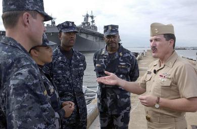 | Keywords: US Navy 041018-N-0962S-293 Master Chief Petty Officer of the Navy (MCPON) Terry Scott talks with the Sailors modeling the Navy's new working uniform concepts in Norfolk, Va.jpg en Norfolk Va Oct 18 2004 - Master Chief Petty Officer of the Navy MCPON Terry Scott talks with the Sailors modeling the Navy's new working uniform concepts in Norfolk Va The new concepts will be wear-tested this winter throughout the fleet were introduced on board the amphibious assault ship USS Iwo Jima LHD 7 during a MCPON All Hands call Iwo Jima will be one of several test platforms throughout the fleet and will help provide necessary feedback to determine the final working uniform design U S Navy photo by Journalist 2nd Class Brandan W Schulze RELEASED 2004-10-18 041018-N-0962S-293 Navy http //www navy mil/view_image asp id 18509 U S Navy photo by Journalist 2nd Class Brandan W Schulze PD-USGov-Military-Navy Naval Station Norfolk Aboard USS Iwo Jima LHD-7 Terry D Scott |