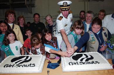 | Keywords: US Navy 041030-N-8148A-038 Commanding Officer, USS Ronald Reagan (CVN 76), Capt. James Symonds, is assisted by Girl Scouts from the San Diego-Imperial County Council, while cutting a cake to celebrate Girl Scouts founder Juliet.jpg en Naval Air Station North Island Calif Oct 30 2004 - Commanding Officer USS Ronald Reagan CVN 76 Capt James Symonds is assisted by Girl Scouts from the San Diego-Imperial County Council while cutting a cake to celebrate Girl Scouts founder Juliette Low's birthday The celebration was part of Girl Scout Day held aboard Ronald Reagan U S Navy photo by Photographer's Mate 3rd Class Kitt Amaritnant RELEASED 2004-10-30 041030-N-8148A-038 Navy http //www navy mil/view_image asp id 18613 U S Navy photo by Photographer's Mate 3rd Class Kitt Amaritnant PD-USGov-Military-Navy Guests at Naval Air Station North Island James Symonds Guests aboard USS Ronald Reagan CVN-76 Cake cutting Girl Scouts of the USA |