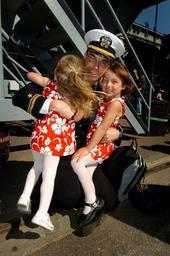 | Keywords: US Navy 041101-N-6213R-050 Lt.j.g. Brad Maronde is welcomed home by his daughters after disembarking from the Nimitz-class aircraft carrier USS John C. Stennis (CVN 74) at Naval Air Station North Island in San Diego, Calif.jpg en San Diego Calif Nov 1 2004 - Lt j g Brad Maronde is welcomed home by his daughters after disembarking from the Nimitz-class aircraft carrier USS John C Stennis CVN 74 at Naval Air Station North Island in San Diego Calif Stennis and embarked Carrier Air Wing Fourteen CVW-14 returned home to thousands of awaiting family and friends from a five-month deployment to the Western Pacific Ocean U S Navy photo by Photographer's Mate 3rd Class Mark J Rebilas RELEASED 2004-11-01 041101-N-6213R-050 Navy http //www navy mil/view_image asp id 18706 U S Navy photo by Photographer's Mate 3rd Class Mark J Rebilas PD-USGov-Military-Navy Aboard USS John C Stennis CVN-74 Naval ship arrivals to Naval Air Station North Island Group hugging Military people of the United States with children Sisters Two matching outfits Crouching adults with children Flowered clothing White tights Photographs by Mark J Rebilas Adult with two children Looking at viewer some Hair in movement Red minidresses |