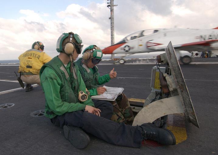 Keywords: US Navy 041113-N-1045B-004 Flight deck crew launch a T-45 ^ldquo,Goshawk^rdquo, assigned to Training Wing One (TW-1) while Aviation Boatswain^rsquo,s Mates monitor the steam pressure of the ship's catapults aboard USS George W.jpg en Atlantic Ocean Nov 13 2004 Flight deck crew launch a T-45 Goshawk assigned to Training Wing One TW-1 while Aviation Boatswain s Mates monitor the steam pressure of the ship's catapults aboard USS George Washington CVN 73 The Norfolk Va -based Nimitz-class aircraft carrier is conducting routine training off the East Coast of the United States U S Navy photo by Photographer's Mate Airman Michael D Blackwell II RELEASED 2004-11-13 041113-N-1045B-004 Navy http //www navy mil/view_image asp id 18882 U S Navy photo by Photographer's Mate Airman Michael D Blackwell II PD-USGov-Military-Navy Aboard USS George Washington CVN-73 McDonnell Douglas T-45 Goshawk |