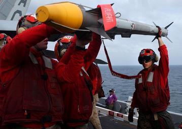| Keywords: US Navy 041115-N-6363M-010 U.S. Marine ordnancemen load a AIM-9X Sidewinder missile on a wing pylon aboard an F-A-18A- Hornet.jpg en Arabian Sea Nov 15 2004 - U S Marine ordnancemen assigned to the Silver Eagles of Marine Fighter Attack Squadron One One Five VMFA-115 load a AIM-9X Sidewinder missile on a wing pylon aboard an F/A-18A+ Hornet The AIM-9X is a supersonic heat-seeking air-to-air missile that can be fired day or night and is currently the newest air-to-air missile in the Navy and Marine Corps inventory Truman and embarked Carrier Air Wing Three CVW-3 are currently on a scheduled deployment in support of the Global War on Terrorism U S Navy photo by Photographer's Mate Airman Philip V Morrill RELEASED 2004-11-15 041115-N-6363M-010 Navy http //www navy mil/view_image asp id 18934 U S Navy photo by Photographer's Mate Airman Philip V Morrill PD-USGov-Military-Navy AIM-9 Sidewinder Aviation Ordnanceman |