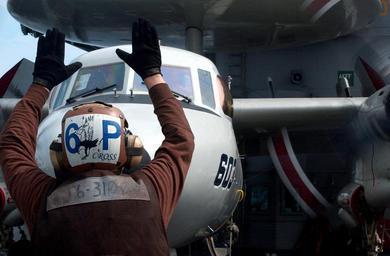 | Keywords: US Navy 041116-N-0989T-009 A plane captain uses hand signals to communicate with the air crew of an E-2C Hawkeye aircraft.jpg en Arabian Sea Nov 16 2004 - A plane captain assigned to the Seahawks of Carrier Airborne Early Warning Squadron One Two Six VAW-126 uses hand signals to communicate with the air crew of an E-2C Hawkeye aircraft Truman and embarked Carrier Air Wing Three CVW-3 are currently on a scheduled deployment in support of the Global War on Terrorism U S Navy by photographer's Mate 2nd Class Jason P Taylor RELEASED 2004-11-16 041116-N-0989T-009 Navy http //www navy mil/view_image asp id 18937 U S Navy photo PD-USGov-Military-Navy Aboard USS Harry S Truman CVN-75 Northrop Grumman E-2C Hawkeye on flight decks Airborne Early Warning Squadron 126 United States Navy |