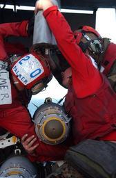 | Keywords: US Navy 041129-N-0989T-002 U.S. Marine Corps Ordnancemen lifts a GBU-38 satellite-guided bomb onto a weapons pylon on an F-A-18A Hornet.jpg en Persian Gulf Nov 29 2004 U S Marine Corps Ordnancemen assigned to the Silver Eagles of Marine Fighter Attack Squadron One One Five VMFA-115 lifts a GBU-38 satellite-guided bomb onto a weapons pylon on an F/A-18A Hornet aboard the Nimitz-class aircraft carrier USS Harry S Truman CVN 75 The GBU-38 is a 500-pound Joint Direct Attack Munition JDAM that uses a standard Mk-82 bomb and was developed for precision bombing in urban warfare The Joint Direct Attack Munition JDAM is a guidance kit that converts existing unguided bombs into precision-guided smart munitions The tail section contains an inertial navigational system INS and a global positioning system GPS JDAM improves the accuracy of unguided bombs in any weather condition Truman's Carrier Strike Group Ten CSG-10 and her embarked Carrier Airwing Three CVW-3 are currently on a scheduled deployment in support of the Global War on Terrorism U S Navy photo by Photographer's Mate 2nd Class Jason P Taylor RELEASED 2004-11-29 041129-N-0989T-002 Navy http //www navy mil/view_image asp id 19294 U S Navy photo by Photographer's Mate 2nd Class Jason P Taylor PD-USGov-Military-Navy GBU-38 Aboard USS Harry S Truman CVN-75 |