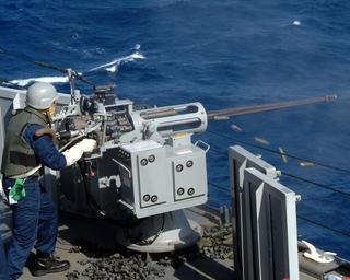 | Keywords: US Navy 041210-N-2970T-003 Gunner's Mate Seaman Daniel A. Wright fires an Mk-38 25mm machine gun during a general quarters (GQ) drill aboard the dock landing ship USS Fort McHenry (LSD 43).jpg en Sea of Japan Dec 10 2004 - Gunner's Mate Seaman Daniel A Wright fires an Mk-38 25mm machine gun during a general quarters GQ drill aboard the dock landing ship USS Fort McHenry LSD 43 The Mk-38 25mm machine gun system is a single-barrel air-cooled heavy machine gun capable of firing 175 rounds per minute Fort McHenry is currently enroute to the Philippines in support of the United States humanitarian assistance and relief efforts on the east coast of Luzon after a series of typhoons devastated the area U S Navy photo by Photographer s Mate Airman Marvin E Thompson Jr RELEASED 2004-12-10 041210-N-2970T-003 Navy http //www navy mil/view_image asp id 19502 U S Navy photo by Photographer s Mate Airman Marvin E Thompson Jr PD-USGov-Military-Navy Aboard USS Fort McHenry LSD-43 Mk 38 25mm chain gun Weapon training Cartridge ejection Gunner's Mate |