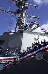 | Keywords: US Navy 041211-N-3768B-002 Sailors enact the longstanding Naval tradition of manning the rails after bringing the ship to life aboard the newly commissioned guided missile destroyer USS James E. Williams (DDG 95).jpg en Charleston S C Dec 11 2004 Sailors enact the longstanding Naval tradition of manning the rails after bringing the ship to life aboard the newly commissioned guided missile destroyer USS James E Williams DDG 95 at the Naval Weapons Station in Charleston S C The ship honors Boatswain s Mate 1st Class James E Williams one of the Navy's most highly decorated enlisted Sailors having been awarded the Congressional Medal of Honor for bravery and leadership in 1966 while serving as patrol boat captain and patrol commander of River Patrol Boat PBR 105 on the Mekong River Republic of Vietnam James E Williams will be commissioned Saturday Dec 11th as the 45th Arleigh Burke-class guided missile destroyer authorized by Congress U S Navy photo by Journalist 2nd Class Jim Brown RELEASED 2004-12-11 041211-N-3768B-002 Navy http //www navy mil/view_image asp id 19559 U S Navy photo by Journalist 2nd Class Jim Brown PD-USGov-Military-Navy Images from US Navy location Charleston S C USS James E Williams DDG-95 Manning the rail in the United States Navy |