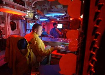 | Keywords: US Navy 041211-N-4308O-037 Lt. Cmdr. George Sharp, flight deck handler aboard USS Harry S. Truman (CVN-75) monitors night flight operations from Flight Deck Control.jpg en Persian Gulf Dec 11 2004 Lt Cmdr George Sharp flight deck handler aboard USS Harry S Truman CVN-75 monitors night flight operations from Flight Deck Control Currently aircraft from Carrier Air Wing Three CVW-3 embarked aboard Truman is providing close air support conducting intelligence surveillance and reconnaissance missions in ongoing operations over Iraq Truman s Carrier Strike Group Ten CSG-10 and CVW-3 are on a regularly scheduled deployment in support of the Global War on Terrorism US Navy photo by Photographer s Mate Airman Ryan O'Connor RELEASED 2004-12-11 041211-N-4308O-037 Navy http //www navy mil/view_image asp id 19741 U S Navy photo PD-USGov-Military-Navy Aboard USS Harry S Truman CVN-75 Ouija boards aircraft carrier Military activities at night |