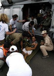 | Keywords: US Navy 050103-N-4166B-184 Sailors, assigned to Carrier Air Wing Two (CVW-2) and aid workers unload injured Indonesians from the cabin of an MH-60S Knighthawk helicopter.jpg en Aceh Sumatra Indonesia Jan 3 2005 - Sailors assigned to Carrier Air Wing Two CVW-2 and aid workers unload injured Indonesians from the cabin of an MH-60S Knighthawk helicopter assigned to the Gunbearers of Helicopter Combat Support Squadron Eleven HC-11 Detachment Two to a triage site for treatment and evaluation Medical teams from USS Abraham Lincoln CVN 72 Carrier Air Wing Two CVW-2 and the International Organization for Migration IOM set-up a triage site located on Sultan Iskandar Muda Air Force Base in Banda Aceh Sumatra The two teams worked together with members of the Australian Air Force to provide initial medical care to victims of the Tsunami-stricken coastal regions The Abraham Lincoln Carrier Strike Group is currently operating in the Indian Ocean off the waters of Indonesia and Thailand U S Navy photo by Photographer's Mate Airman Jordon R Beesley RELEASED 2005-01-03 050103-N-4166B-184 Navy http //www navy mil/view_image asp id 20098 U S Navy photo by Photographer's Mate Airman Jordon R Beesley PD-USGov-Military-Navy Aceh Humanitarian aid in Indonesia Helicopter Combat Support Squadron 11 United States Navy |
