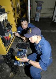 | Keywords: US Navy 050106-N-9951E-022 Chief Electrician's Mate Conrad Capindo, foreground, and Electrician's Mate 2nd Class Alex Taliman, work on the emergency diesel power generator behind the main hospital in Aceh, Sumatra, Indonesia.jpg en Aceh Sumatra Indonesia Jan 6 2005 - Chief Electrician's Mate Conrad Capindo foreground and Electrician's Mate 2nd Class Alex Taliman work on the emergency diesel power generator behind the main hospital in Aceh Sumatra Indonesia The hospital was flooded in over four feet of water during the Tsunami that struck December 26 2004 which shorted all electrical power to the hospital Small generators are temporarily being used to provide electricity to some of the vital systems the hospital needs to care for patients The USS Abraham Lincoln CVN 72 Carrier Strike Group is currently operating in the Indian Ocean off the waters of Indonesia and Thailand in support of Operation Unified Assistance U S Navy photo by Photographer's Mate 2nd Class Elizabeth A Edwards RELEASED 2005-01-06 050106-N-9951E-022 Navy http //www navy mil/view_image asp id 20284 U S Navy photo by Photographer's Mate 2nd Class Elizabeth A Edwards PD-USGov-Military-Navy Tsunami in Aceh Electrician's Mate |