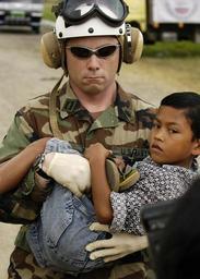 | Keywords: US Navy 050106-N-4166B-287 Lt. Shawn Harris, assigned to the guided missile destroyer USS Shoup (DDG 86), carries an injured boy from an MH-60S Knighthawk helicopter to a triage site.jpg en Banda Aceh January 6 2005-1000 - Lt Shawn Harris assigned to the guided missile destroyer USS Shoup DDG 86 carries an injured boy from an MH-60S Knighthawk helicopter to a triage site setup by various relief groups on the Sultan Iskandar Muda Air Force Base in Aceh Sumatra Medical teams from the USS Abraham Lincoln CVN 72 Carrier Strike Group Carrier Air Wing Two CVW-2 and the International Organization for Migration IOM set-up a triage site located on Sultan Iskandar Muda Air Force Base in Banda Aceh Sumatra The two teams worked together with members of the Australian Air Force to provide initial medical care to victims of the Tsunami-stricken coastal regions The Abraham Lincoln Carrier Strike Group is currently operating in the Indian Ocean off the waters of Indonesia and Thailand in support of Operation Unified Assistance U S Navy photo by Photographer s Mate Airman Jordon R Beesley RELEASED January 6 2005-1000 050106-N-4166B-287 Navy http //www navy mil/view_image asp id 20294 U S Navy photo by Photographer s Mate Airman Jordon R Beesley PD-USGov-Military-Navy Banda Aceh Military people of the United States with children |