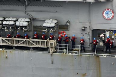 | Keywords: US Navy 050111-N-6074Y-006 Sailors assigned to the deck department aboard the guided missile cruiser USS Shiloh (CG-67), man the line during an underway replenishment.jpg en Indian Ocean Jan 11 2005 - Sailors assigned to the deck department aboard the guided missile cruiser USS Shiloh CG-67 man the line during an underway replenishment with the Military Sealift Command MSC fast combat support ship USNS Rainier T-AOE 7 Shiloh and Rainier are currently assigned to the USS Abraham Lincoln CVN 72 Carrier Strike Group operating in the Indian Ocean off the waters of Indonesia and Thailand in support of Operation Unified Assistance U S Navy photo by Photographer's Mate 3rd Class M Jeremie Yoder RELEASED 2005-01-11 050111-N-6074Y-006 Navy http //www navy mil/view_image asp id 20950 U S Navy photo by Photographer's Mate 3rd Class M Jeremie Yoder PD-USGov-Military-Navy Line handlers underway replenishment Aboard USS Abraham Lincoln CVN-72 |