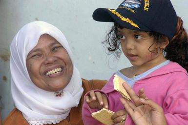 | Keywords: US Navy 050114-N-2560Y-161 A local woman and her child, expresses appreciation to Sailors from the USS Abraham Lincoln (CVN-72) and Carrier Air Wing Two (CVW-2) distributing food and water.jpg en Banda Aceh Sumatra Indonesia Jan 14 2005 - A local woman and her child expresses appreciation to Sailors from USS Abraham Lincoln CVN 72 and Carrier Air Wing Two CVW-2 for distributing food and water Helicopters and Aircraft assigned to CVW-2 are supporting Operation United Assistance the humanitarian operation effort in the wake of the Tsunami that struck South East Asia The Abraham Lincoln Carrier Strike Group is currently operating in the Indian Ocean off the waters of Indonesia and Thailand U S Navy photo by Photographer's Mate 1st Class John D Yoder RELEASED 2005-01-14 050114-N-2560Y-161 Navy http //www navy mil/view_image asp id 20614 U S Navy photo by Photographer's Mate 1st Class John D Yoder PD-USGov-Military-Navy Women of Indonesia Hijabs in Indonesia Banda Aceh |