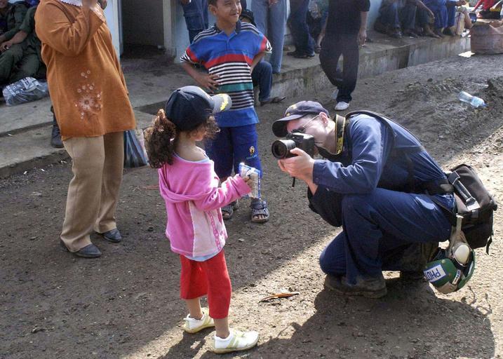 | Keywords: US Navy 050114-N-2560Y-154 Photographer's Mate 3rd Class Tyler Clements, assigned to USS Abraham Lincoln (CVN 72), takes a photograph of a young Indonesia girl.jpg en Banda Aceh Sumatra Indonesia Jan 14 2005 - Photographer's Mate 3rd Class Tyler Clements assigned to USS Abraham Lincoln CVN 72 takes a photograph of a young Indonesia girl The little girl is waiting with her family for an airlift to another area of Indonesia not affected by the recent Tsunami that devastated the Indonesian area of Banda Aceh on the island of Sumatra Indonesia U S Military personnel are assisting local authorities using helicopters to transport supplies bringing in disaster relief teams and to support humanitarian airlifts to tsunami-stricken coastal regions The Abraham Lincoln Carrier Strike Group and her embarked Carrier Air Wing Two CVW-2 are currently operating in the Indian Ocean region off the coast of Indonesia and Thailand in support of Operation Unified Assistance the humanitarian effort in the wake of the Tsunami that struck South East Asia U S Navy photo by Photographer's Mate 1st Class John D Yoder RELEASED 2005-01-14 050114-N-2560Y-154 Navy http //www navy mil/view_image asp id 20670 U S Navy photo by Photographer's Mate 1st Class John D Yoder PD-USGov-Military-Navy Banda Aceh Photographers Mate People with cameras |