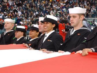 | Keywords: US Navy 050116-N-4729H-146 Sailors from Naval Air Station Joint Reserve Base Willow Grove, Pa. hold a giant American flag in a National Football League pregame ceremony in Philadelphia between the Philadelphia Eagles and Minnes.jpg en Philadelphia Pa Jan 16 2005 - Sailors from Naval Air Station Joint Reserve Base Willow Grove Pa hold a giant American flag in a National Football League pregame ceremony in Philadelphia between the Philadelphia Eagles and Minnesota Vikings A total of 125 military men and women displayed the flag after practicing for several hours at the Eagles' practice field The military team had 35 seconds to take their places and roll out the continental U S -shaped flag before the start of the National Anthem The Eagles organization also gave free game tickets to the military members The Eagles downed the Vikings 27-14 and now move on to the NFC Championship game U S Navy photo by Chief Journalist Monica Hallman RELEASED 2005-01-16 050116-N-4729H-146 Navy http //www navy mil/view_image asp id 20762 U S Navy photo by Chief Journalist Monica Hallman PD-USGov-Military-Navy Military in Pennsylvania |