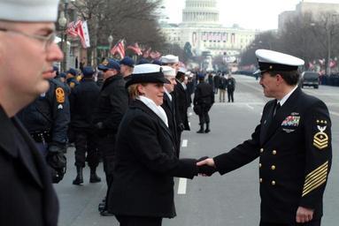 | Keywords: US Navy 050120-N-0962S-060 Master Chief Petty Officer of the Navy (MCPON) Terry Scott shakes hands with one of the hundreds of Sailors who helped line the street cordon down Pennsylvania Avenue for the Inauguration Day Parade.jpg en Washington D C Jan 20 2005 - Master Chief Petty Officer of the Navy MCPON Terry Scott shakes hands with one of the hundreds of Sailors who helped line the street cordon down Pennsylvania Avenue for the Inauguration Day Parade held in Washington D C More than 5 000 men and women in uniform took part in the 55th Presidential Inauguration U S Navy photo by Journalist 2nd Class Brandan W Schulze RELEASED 2005-01-20 050120-N-0962S-060 Navy http //www navy mil/view_image asp id 21042 U S Navy photo by Journalist 2nd Class Brandan W Schulze PD-USGov-Military-Navy People of the United States Navy George W Bush 2005 presidential inauguration Terry D Scott Handshakes involving the military |