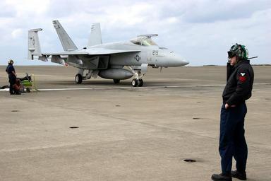 | Keywords: US Navy 050122-N-1113S-008 Aviation Structural Mechanic 1st Class Cameron Bloom, listens to instructions on his radio prior to launching an F-A-18E Super Hornet.jpg en Iwo Jima Air Base Japan Jan 22 2005 - Aviation Structural Mechanic 1st Class Cameron Bloom listens to instructions on his radio prior to launching an F/A-18E Super Hornet assigned to the Royal Maces of Strike Fighter Squadron Two Seven VFA-27 on board Iwo Jima Air Base Japan Petty Officer Bloom is VFA-27's Flight Line Coordinator in charge of launching and recovering aircraft Several aircraft assigned to Carrier Air Wing Five CVW-5 detached to Iwo Jima Air Base to allow pilots to get carrier landing qualified Iwo Jima roughly 700 miles south of Japan's main islands serves as a location for these pilots to earn these qualifications far away from the challenges presented by flying in the densely populated suburbs surrounding U S Naval Air Facility Atsugi where CVW-5 is forward deployed Training was completed Monday Jan 24 with the return of personnel to their home bases U S Navy photo by Journalist 3rd Class Matthew R Schwarz RELEASED 2005-01-22 050122-N-1113S-008 Navy http //www navy mil/view_image asp id 21086 U S Navy photo by Journalist 3rd Class Matthew R Schwarz PD-USGov-Military-Navy Images from US Navy location Iwo Jima Air Base Japan Aviation Structural Mechanic F/A-18E Super Hornet Strike Fighter Squadron 27 United States Navy |