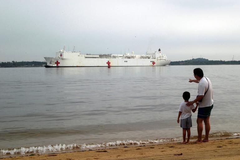 Keywords: US Navy 050129-N-0493B-007 A Singaporean man shows his son the Military Sealift Command hospital ship USNS Mercy (T-AH 19) as it transits the Johor Strait that separates Singapore and Malaysia.jpg en Singapore Jan 29 2005 - A Singaporean man shows his son the Military Sealift Command hospital ship USNS Mercy T-AH 19 as it transits the Johor Strait that separates Singapore and Malaysia Mercy has been forward deployed to support Operation Unified Assistance the humanitarian operation effort in the wake of the tsunami that struck Southeast Asia Mercy contains twelve fully equipped operating rooms a 1 000-bed hospital facility digital radiological services a diagnostic and clinical laboratory a pharmacy an optometry lab a cat scan and two oxygen-producing plants The hospital ship is a converted San Clemente-class super tanker Mercy is a very visible and humanitarian symbol of not only America s commitment to tsunami victims but also its enduring commitment to the people of the region U S Navy photo by Lt Chuck Bell RELEASED 2005-01-29 050129-N-0493B-007 Navy http //www navy mil/view_image asp id 21316 U S Navy photo by Lt Chuck Bell PD-USGov-Military-Navy Naval ships of the United States in Singapore General views of USNS Mercy T-AH-19 |