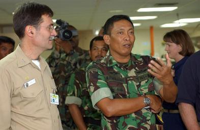 | Keywords: US Navy 050210-N-6504N-007 Commander of the Indonesian government disaster relief operation in Banda Aceh, Maj. Gen. Bambang Darmono, talks to a doctor that works in the operating room aboard the Military Sealift Command (MSC).jpg en Indian Ocean Feb 10 2005 - Commander of the Indonesian government disaster relief operation in Banda Aceh Maj Gen Bambang Darmono talks with Capt Mark Llewellyn commanding officer of the Medical Treatment Facility aboard the Military Sealift Command MSC hospital ship USNS Mercy T-AH 19 as he visited the ship Darmono also visited several Indonesian patients while he was aboard the ship Mercy will serve as an enabling platform to assist humanitarian operations ashore in ways that host nations and international relief organization find useful Mercy is currently off the waters of Indonesia in support of Operation Unified Assistance the humanitarian relief effort to aid the victims of the tsunami that struck Southeast Asia U S Navy photo by Journalist 3rd Class Isaac Needleman RELEASED 2005-02-10 050210-N-6504N-007 Navy http //www navy mil/view_image asp id 21734 U S Navy photo by Journalist 3rd Class Isaac Needleman PD-USGov-Military-Navy Aboard USNS Mercy T-AH-19 |