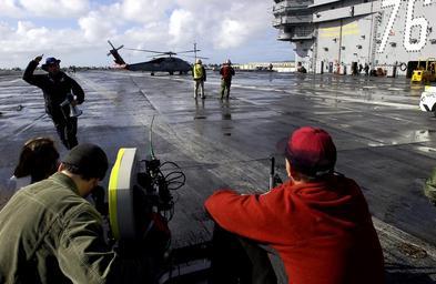 | Keywords: US Navy 050304-N-8213G-039 A member of an NBC television crew shouts Roll Camera, ACTION^ as he runs to the back of the set for a new television show called Fathom during filming on the flight deck aboard USS Ronald Reagan (CVN.jpg en San Diego Calif Mar 4 2005 - A member of an NBC television crew shouts Roll Camera ACTION as he runs to the back of the set for a new television show called Fathom during filming on the flight deck aboard USS Ronald Reagan CVN 76 Fathom is a science fiction television show about a pilot and his sea quests that will be aired on NBC The Nimitz-class aircraft carrier Ronald Reagan is currently in port on board Naval Air Station North Island Calif U S Navy photo by Photographer's Mate Airman Konstandinos Goumenidis RELEASED 2005-03-04 050304-N-8213G-039 Navy http //www navy mil/view_image asp id 22660 U S Navy photo by Photographer's Mate Airman Konstandinos Goumenidis PD-USGov-Military-Navy Guests at Naval Air Station North Island Aboard USS Ronald Reagan CVN-76 Filming |