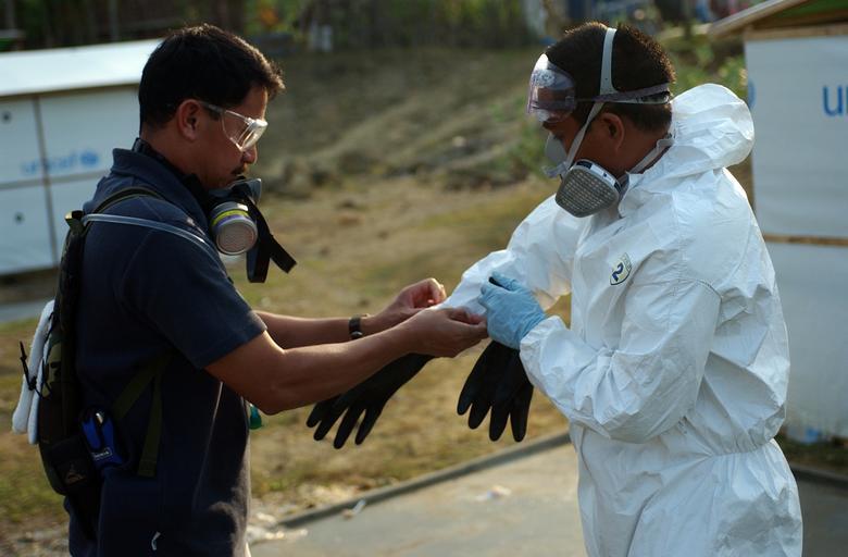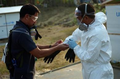 | Keywords: US Navy 050309-N-8796S-031 Chief Hospital Corpsman Alberto Redublo, left, helps Hospital Corpsman 2nd Class Richard Cabatit as he dons his personal protective equipment for spraying pesticides.jpg en Banda Aceh Sumatra Indonesia Mar 9 2005 Chief Hospital Corpsman Alberto Redublo left helps Hospital Corpsman 2nd Class Richard Cabatit as he dons his personal protective equipment for spraying pesticides Both assigned to Navy Environmental Preventive Medicine Unit Six NEPMU-6 they are spraying pesticides to kill flying insects known to spread disease NEPMU-6 is based out of Pearl Harbor Hawaii and is augmented by environmental and preventive medicine personnel from other units across the U S NEPMU-6 is currently operating in Banda Aceh on the island of Sumatra Indonesia and is conducting daily operations to assess health concerns including water soil studies disease and vector control in displaced personnel camps U S Navy photo by Photographer's Mate 2nd Class Timothy Smith RELEASED 2005-03-09 050309-N-8796S-031 Navy http //www navy mil/view_image asp id 22610 U S Navy photo by Photographer's Mate 2nd Class Timothy Smith PD-USGov-Military-Navy Banda Aceh Hospital Corpsman |