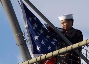 | Keywords: US Navy 050325-N-2970T-004 Storekeeper 3rd Class Jenovitz Danscel, assigned to the amphibious dock landing ship USS Fort McHenry (LSD 43) prepares to hoist the American Flag during morning colors.jpg en U S Fleet Activities Sasebo Japan Mar 25 2005 - Storekeeper 3rd Class Jenovitz Danscel assigned to the amphibious dock landing ship USS Fort McHenry LSD 43 prepares to hoist the American Flag during morning colors Fort McHenry recently returned to U S Fleet Activities Sasebo Japan after spending nearly three months at sea in support of Combined Support Force Five Three Six CTF-536 providing humanitarian aid and disaster relief to the victims of the December 26 2004 tsunami in southeast Asia and the 60th Anniversary of the Battle of Iwo Jima commemoration U S Navy photo by Photographer's Mate Airman Marvin E Thompson Jr RELEASED 2005-03-25 050325-N-2970T-004 Navy http //www navy mil/view_image asp id 23006 U S Navy photo by Photographer's Mate Airman Marvin E Thompson Jr PD-USGov-Military-Navy United States Fleet Activities Sasebo Aboard USS Fort McHenry LSD-43 Storekeeper Flag hoisting |