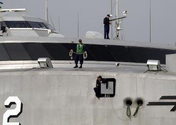| Keywords: US Navy 050325-N-3503S-008 Line handlers aboard the High Speed Vessel Two (HSV 2) Swift, prepare to throw mooring lines as Swift prepares to moor in Augusta Bay, Sicily.jpg en Augusta Bay Sicily Mar 25 2005 - Line handlers aboard the High Speed Vessel Two HSV 2 Swift prepare to throw mooring lines as Swift prepares to moor in Augusta Bay Sicily Swift is a wave-piercing aluminum-hulled catamaran that can move at speeds greater than 45 knots With a draft allowing it to navigate in only 12 feet of water it can easily maneuver in and out of littoral environments Photographer's Mate 2nd Class Brain P Smarr RELEASED 2005-03-25 050325-N-3503S-008 Navy http //www navy mil/view_image asp id 23037 U S Navy photo PD-USGov-Military-Navy Images from US Navy location Augusta Bay Sicily Exterior of HSV-2 Swift |