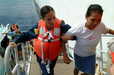 | Keywords: US Navy 050330-N-6504N-002 Hospital Corpsman 3rd Class Lynette Shute, left, helps an East Timorese woman up a boat ramp.jpg en Dili East Timor Mar 30 2005 - Hospital Corpsman 3rd Class Lynette Shute left helps an East Timorese woman up a boat ramp leading into Military Sealift Command MSC hospital ship USNS Mercy T-AH 19 Several East Timorese were brought aboard Mercy for medical care Mercy is currently off the coast of Dili East Timor providing humanitarian assistance to the people of Dili While ashore Mercy's crew will focus on public health primary care dental treatment preventive medicine health education and pharmaceutical support Mercy's deployment is part of the U S commitment to Southeast Asia and the Pacific Island nations U S Navy photo by Journalist 3rd Class Isaac Needleman RELEASED 2005-03-30 050330-N-6504N-002 Navy http //www navy mil/view_image asp id 23182 U S Navy photo by Journalist 3rd Class Isaac Needleman PD-USGov-Military-Navy Aboard USNS Mercy T-AH-19 Healthcare in East Timor Hospital Corpsman United States Navy images from East Timor |