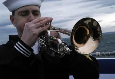 | Keywords: US Navy 050331-N-3390M-126 A crew member assigned to guided missile destroyer USS Momsen (DDG 92) plays taps during a burial at sea ceremony to honor the passing of Capt. Charles Bowers Momsen, Jr.jpg en Everett Wash Mar 31 2005 - A crew member assigned to guided missile destroyer USS Momsen DDG 92 plays taps during a burial at sea ceremony to honor the passing of Capt Charles Bowers Momsen Jr The vessel is named for Capt Momsen s father Adm Charles Swede Momsen inventor of the Momsen lung submarine rescue system The ceremony took place where the Straits of Juan de Fuca and the Straits of Georgia merge into the Pacific waters of the Puget Sound U S Navy photo by Photographer s Mate 3rd Class Douglas G Morrison RELEASED 2005-03-31 050331-N-3390M-126 Navy http //www navy mil/view_image asp id 23305 U S Navy photo by Photographer s Mate 3rd Class Douglas G Morrison PD-USGov-Military-Navy Naval Station Everett USS Momsen DDG-92 Sea burials |