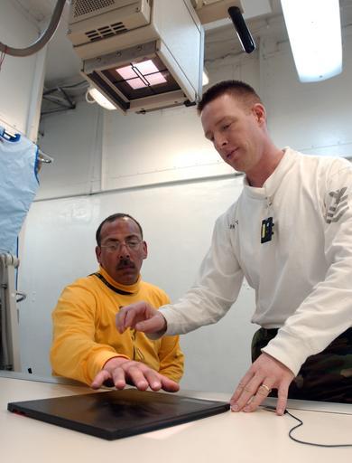 Keywords: US Navy 050404-N-6410T-001 Hospital Corpsman 1st Class Troy Murphy, right, prepares a patient^rsquo,s hand for an X-ray.jpg en Atlantic Ocean Apr 4 2005 - Hospital Corpsman 1st Class Troy Murphy right prepares a patient s hand for an X-ray aboard the Nimitz-class aircraft carrier USS Theodore Roosevelt CVN 71 Roosevelt is currently underway for Tailored Ship Training Availability and Final Evaluation Problem TSTA/FEP in the Atlantic Ocean U S Navy photo by Photographer's Mate Airman Chris Thamann RELEASED 2005-04-04 050404-N-6410T-001 Navy http //www navy mil/view_image asp id 23347 U S Navy photo by Photographer's Mate Airman Chris Thamann PD-USGov-Military-Navy Hospital Corpsman Aboard USS Theodore Roosevelt CVN-71 |