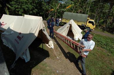 | Keywords: US Navy 050420-N-8629M-022 U.S. Navy Sailors and Civilian Mariners from the Military Sealift Command (MSC) ships, USNS Niagara Falls (T-AFS 3), USNS San Jose (T-AFS 7) and USNS Mercy (T-AH 19), unload a truck-load of supplies.jpg en Nias Indonesia April 20 2005 - U S Navy Sailors and Civilian Mariners from the Military Sealift Command MSC ships USNS Niagara Falls T-AFS 3 USNS San Jose T-AFS 7 and USNS Mercy T-AH 19 unload a truck-load of supplies for a community relations project to paint and repair damaged buildings at a nursing school in Nias Indonesia At the request of the government of Indonesia the Military Sealift Command MSC hospital ship USNS Mercy T-AH 19 MSC combat stores ships USNS Niagara Falls T-AFS 3 and USNS San Jose T-AFS 7 are on station off the coast of Nias providing assistance as determined appropriate and necessary with earthquake disaster relief efforts and provide medical assistance to those in need U S Navy photo by Photographer's Mate 3rd Class Rebecca J Moat RELEASED 2005-04-20 050420-N-8629M-022 Navy http //www navy mil/view_image asp id 23785 U S Navy photo by Photographer's Mate 3rd Class Rebecca J Moat PD-USGov-Military-Navy Images from US Navy location Nias Indonesia Aboard USS Niagara Falls AFS-3 Tents |