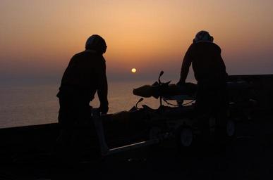 | Keywords: US Navy 050424-N-9446C-067 Aviation ordnancemen move Carrier Air Training Missiles (CATMs) from the.jpg en Persian Gulf April 24 2005 - Aviation ordnancemen move Carrier Air Training Missiles CATMs from the Bomb Farm into position for attachment to aircraft prior to flight operations aboard the Nimitz-class aircraft carrier USS Carl Vinson CVN 70 The Carl Vinson Carrier Strike Group is conducting operations in support of multi-national forces in Iraq and maritime security operations in the Persian Gulf Carl Vinson will end its deployment with a homeport shift to Norfolk Va and will conduct a three-year refuel and complex overhaul U S Navy photo by Photographer's Mate Airman Refugio Carrillo RELEASED 2005-04-24 050424-N-9446C-067 Navy http //www navy mil/view_image asp id 23894 U S Navy photo by Photographer's Mate Airman Refugio Carrillo PD-USGov-Military-Navy Aboard USS Carl Vinson CVN-70 Aviation Ordnanceman Silhouettes of men Brown sunsets People with sunsets |
