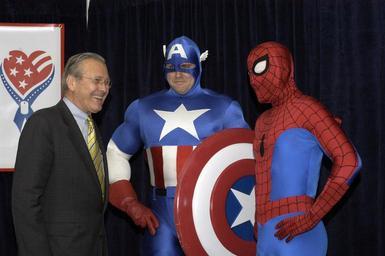 | Keywords: US Navy 050428-N-0295M-001 Secretary of Defense Donald Rumsfeld meets superheroes Captain America and Spider-Man during the unveiling of a comic book that will be distributed free to U.S. forces in Iraq and around the world.jpg en Pentagon Washington D C April 28 2005 - Secretary of Defense Donald Rumsfeld meets superheroes Captain America and Spider-Man during the unveiling of a comic book that will be distributed free to U S forces in Iraq and around the world Featuring the Avengers Fantastic Four Spider-Man and other Marvel heroes the comic book will have a print run of one million copies and be distributed through the military exchanges The first 150 000 copies will be distributed to personnel in the Middle East The comic book is part of America Supports You a Department of Defense campaign that encourages private citizens communities and businesses to reach out to military personnel and their families U S Navy photo by Photographer's Mate 2nd Class Daniel J McLain RELEASED 2005-04-28 050428-N-0295M-001 Navy http //www navy mil/view_image asp id 24005 U S Navy photo by Photographer's Mate 2nd Class Daniel J McLain PD-USGov-Military-Navy Cosplay of Spider-Man and his cast Cosplay of Captain America and his cast Donald Rumsfeld in 2005 America Supports You |