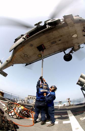 Keywords: US Navy 050514-N-5526M-006 Seaman Ruslan Stanischevskiy and Seaman John Parker both assigned to Deck Department aboard the guided missile cruiser USS Normandy (CG 60), attach a cargo pendant to an MH-60S Seahawk helicopter.jpg en Gulf of Aden May 14 2005 - Seaman Ruslan Stanischevskiy and Seaman John Parker both assigned to Deck Department aboard the guided missile cruiser USS Normandy CG 60 attach a cargo pendant to an MH-60S Seahawk helicopter Normandy conducted a vertical replenishment at sea with the fast combat support ship USS Camden AOE 2 Normandy is currently conducting Maritime Security Operations MSO in the 5th Fleet area of responsibility U S Navy photo by Photographer's Mate 1st Class Robert R McRill RELEASED 2005-05-14 050514-N-5526M-006 Navy http //www navy mil/view_image asp id 24412 U S Navy photo by Photographer's Mate 1st Class Robert R McRill PD-USGov-Military-Navy MH-60S helihoisting cargo USS Camden AOE-2 Aboard USS Normandy CG-60 Photographs by Robert R McRill |