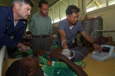 | Keywords: US Navy 050516-N-7027P-089 Hospital Corpsman 2nd Class Anthony Ecija performs an ultra sound on a patient at the Modilon General Hospital.jpg en Madang Papua New Guinea May 16 2005 - Hospital Corpsman 2nd Class Anthony Ecija performs an ultra sound on a patient at the Modilon General Hospital in Madang Papua New Guinea as Capt Tim Bemiller and a local doctor review the next step needed in the medical care of the patient Mercy and the MSC combat stores ship USNS Niagara Falls T-AFS 3 are on station off the coast of Papua New Guinea to provide humanitarian assistance and focused medical care to the residents of the area Mercy is en route to its homeport of San Diego after taking part in Operation Unified Assistance in support of tsunami and earthquake relief operations in Indonesia U S Navy photo by Photographer's Mate 2nd Class Sandra M Palumbo RELEASED 2005-05-16 050516-N-7027P-089 Navy http //www navy mil/view_image asp id 24350 U S Navy photo by Photographer's Mate 2nd Class Sandra M Palumbo PD-USGov-Military-Navy Madang Hospital Corpsman Aboard USS Niagara Falls AFS-3 |