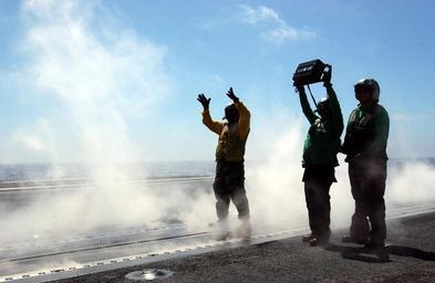 | Keywords: US Navy 050519-N-8148A-037 An aircraft director guides an aircraft into launch position as Aviation Boatswain^rsquo,s Mates verify its weight prior to launch from the flight deck aboard the Nimitz-class aircraft carrier USS Ron.jpg en Pacific Ocean May 19 2005 An aircraft director guides an aircraft into launch position as Aviation Boatswain s Mates verify its weight prior to launch from the flight deck aboard the Nimitz-class aircraft carrier USS Ronald Reagan CVN 76 Reagan is currently underway in the Pacific Ocean conducting carrier qualifications for west coast Fleet Replacement Squadrons U S Navy photo by Photographer's Mate 3rd Class Kitt Amaritnant RELEASED 2005-05-19 050519-N-8148A-037 Navy http //www navy mil/view_image asp id 24535 U S Navy photo by Photographer's Mate 3rd Class Kitt Amaritnant PD-USGov-Military-Navy Aboard USS Ronald Reagan CVN-76 |