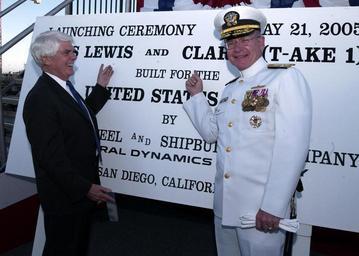 | Keywords: US Navy 050521-N-1577S-032 Chief of Naval Operations Adm. Vern Clark and Congressman Jerry Lewis (R-CA), pose for photographs.jpg en San Diego Calif May 21 2005 - Chief of Naval Operations Adm Vern Clark and Congressman Jerry Lewis R-CA pose for photographs before the christening ceremony for the Military Sealift Command MSC auxiliary dry cargo carrier USNS Lewis and Clark T-AKE 1 Lewis and Clark is the first of the newest class of underway replenishment ships built for naval service and is named in honor of the legendary explorers Direct descendents of Capt Meriwether Lewis and Capt William Clark Mrs Jane Lewis Sale Henley and Ms Lisa Clark were on hand to help celebrate the launching of their ancestor's namesake U S Navy photo by Photographer's Mate 3rd Class Timothy F Sosa RELEASED 2005-05-21 050521-N-1577S-032 Navy http //www navy mil/view_image asp id 24585 U S Navy photo by Photographer's Mate 3rd Class Timothy F Sosa PD-USGov-Military-Navy National Steel and Shipbuilding Company Vern Clark Ship christenings in the United States Navy USNS Lewis and Clark T-AKE-1 |
